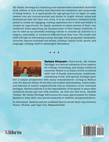 My Italian Heritage is a charming and sophisticated illustrated children's book written in lyric poetry that describes the substance and uniqueness of being Italian. It is appropriate for age group four to eight or early readers who are curious-minded and drawn to bright vibrant colors and illustrations that tell their own story. It is an interactive children's book meant to create an engaging reading experience for a child and reader. It creates an opportunity for family members to share stories of their own childhood while imparting the fundamentals of their family traditions. It can be used…mehr