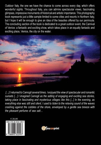 L'Italia all'aperto ci regala meravigliosi scenari. Questo libro fotografico è solo un piccolo campione relativo ad alcune località del Nord Italia, ma sufficiente a dare un'idea delle bellezze che ci mette a disposizione la nostra penisola. In chiusura del libro uno spazio dedicato ad una grande manifestazione all'aperto come il Carnevale di Venezia: uno spettacolo fantastico ed emozionante ambientato in uno scenario altrettanto fantastico ed emozionante quale è la Città Lagunare.