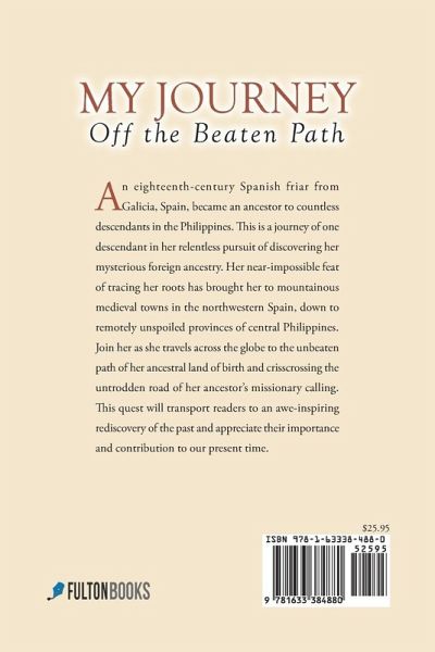 An eighteenth-century Spanish friar from Galicia, Spain, became an ancestor to countless descendants in the Philippines. This is a journey of one descendant in her relentless pursuit of discovering her mysterious foreign ancestry. Her near-impossible feat of tracing her roots has brought her to mountainous medieval towns in the northwestern Spain, down to remotely unspoiled provinces of central Philippines. Join her as she travels across the globe to the unbeaten path of her ancestral land of birth and crisscrossing the untrodden road of her ancestor's missionary calling. This quest will transport readers to an awe-inspiring rediscovery of the past and appreciate their importance and contribution to our present time.