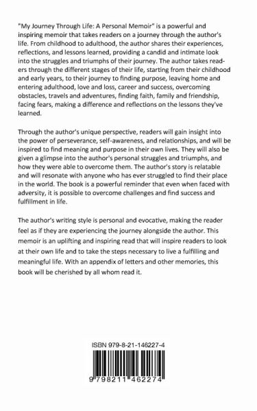 "My Journey Through Life: A Personal Memoir" is a powerful and inspiring memoir that takes readers on a journey through the author's life. From childhood to adulthood, the author shares their experiences, reflections, and lessons learned, providing a candid and intimate look into the struggles and triumphs of their journey. The author takes readers through the different stages of their life, starting from their childhood and early years, to their journey to finding purpose, leaving home and entering adulthood, love and loss, career and success, overcoming obstacles, travels and adventures, finding faith, family and friendship, facing fears, making a difference and reflections on the lessons they've learned. Through the author's unique perspective, readers will gain insight into the power of perseverance, self-awareness, and relationships, and will be inspired to find meaning and purpose in their own lives. They will also be given a glimpse into the author's personal struggles and triumphs, and how they were able to overcome them. The author's story is relatable and will resonate with anyone who has ever struggled to find their place in the world. The book is a powerful reminder that even when faced with adversity, it is possible to overcome challenges and find success and fulfillment in life. The author's writing style is personal and evocative, making the reader feel as if they are experiencing the journey alongside the author. This memoir is an uplifting and inspiring read that will inspire readers to look at their own life and to take the steps necessary to live a fulfilling and meaningful life. With an appendix of letters and other memories, this book will be cherished by all whom read it.