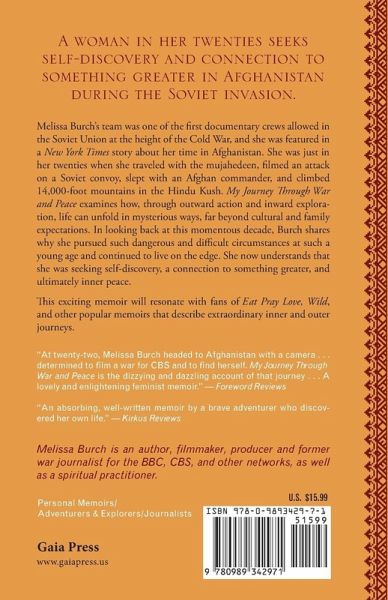 MEMOIR 2017 SILVER WINNER OF IBPA BENJAMIN FRANKLIN AWARD • 2016 SILVER Foreword INDIES AWARD WINNER • For readers of Cheryl Strayed, Martha Beck, and Elizabeth Gilbert In this adventurous spiritual memoir, Melissa Burch discovers that by facing her near death, living outside her comfort zone and trusting her intuition, she could find herself and set a new course for her life. "My Journey Through War and Peace: Explorations of a Young Filmmaker, Feminist and Spiritual Seeker" is based on Melissa Burch's experiences as a war journalist for BBC, CBS, and other networks. Her team was one of the first documentary crews allowed in the Soviet Union at the height of the Cold War, and she was featured in a New York Times story about her time in Afghanistan. She was just in her twenties when she traveled with the mujahideen, filmed an attack on a Soviet convoy, slept with an Afghan commander, and climbed 14,000-foot mountains in the Hindu Kush. "My Journey Through War and Peace" examines how, through outward action and inward exploration, life can unfold in mysterious ways, far beyond cultural and family expectations. In looking back at this momentous decade, Burch shares why she pursued such dangerous and difficult circumstances at such a young age and continued to live on the edge. She now understands that she was seeking self-discovery, a connection to something greater, and ultimately inner peace. This exciting adventurous spiritual memoir will resonate with fans of "Eat Pray Love," "Wild," and other popular memoirs that describe extraordinary inner and outer journeys. Praise for My Journey Through War and Peace "Grittier than Eat Pray Love." ~ Amazon Reviewer "Burch's memoir recounts her remarkable experiences over eight years as a photographer covering the war in Soviet-occupied Afghanistan in the 1980s and as a filmmaker, and also her own personal and spiritual journey as a young woman…. Her accounts provide revealing glimpses into the conflict, Afghan culture, and the dangers of war reporting, particularly for a woman." ~ Publishers Weekly "In this memoir, a documentary filmmaker describes her dramatic journeys, both outward and inward... An absorbing, well-written memoir by a brave adventurer who discovered her own life." ~ Kirkus Reviews "At twenty-two, Melissa Burch headed to Afghanistan with a camera… determined to film a war for CBS and to find herself. MY JOURNEY THROUGH WAR AND PEACE is the dizzying and dazzling account of that journey." ~ Foreword Reviews
