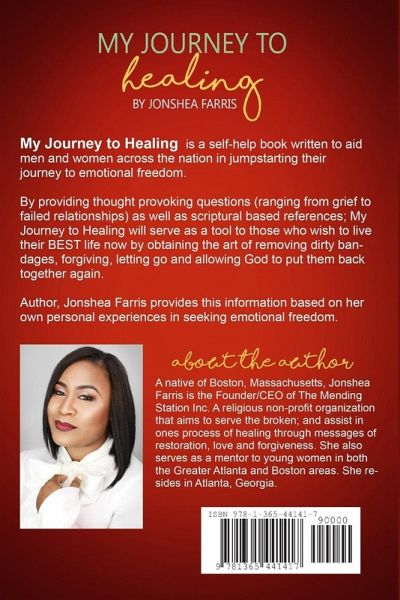 My Journey to Healing is a self-help book written to aid men and women across the nation in jumpstarting their journey to emotional freedom. By providing thought provoking questions (ranging from grieft to failed relationships) as well as scriptural references; My Journey to Healing will serve as a tool to those who wish to live their BEST life now by obtaining the art of removing dirty bandages, forgiving, letting go and allowing God to put them back together again. Author, Jonshea Farris provides this information based on her own personal experiences in seeking emotional freedom.
