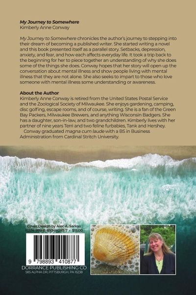 My Journey to Somewhere chronicles the author's journey to stepping into their dream of becoming a published writer. She started writing a novel and this book presented itself as a parallel story. Setbacks, depression, anxiety, and fear, and how each affects everyday life. It took a trip back to the beginning for her to piece together an understanding of why she does some of the things she does. Conway hopes that her story will open up the conversation about mental illness and show people living with mental illness that they are not alone. She also seeks to impart to those who love someone with mental illness some understanding or awareness. About the Author Kimberly Anne Conway is retired from the United States Postal Service and the Zoological Society of Milwaukee. She enjoys gardening, camping, disc golfing, escape rooms, and of course, writing. She is a fan of the Green Bay Packers, Milwaukee Brewers, and anything Wisconsin Badgers. She has a daughter, son-in-law, and two grandchildren. Kimberly lives with her partner of nine years Terri and two feline furbabies, Tank and Hershey. Conway graduated magna cum laude with a BS in Business Administration from Cardinal Stritch University.