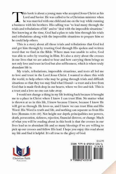 This book is about a young man who accepted Jesus Christ as his Lord and Savior. He was called to be a Christian minister when he was married with one child and one on the way while running a business with his brothers. His calling was "to lead many through the trials and tribulations of life" and to "deal with the impossible situations." Not knowing at the time, God had a plan to take him through his trials and tribulations along with the impossible situations to prepare him so he could help others. This is a story about all those trials and tribulations that God led and got him through by trusting God through His spoken and written word that we find in the Bible. Where man was unable to solve, God was able to solve by trusting in Him. It's also a story about the crosses in our lives that we are asked to bear and how carrying them brings us not only love and trust in God but also selflessness, which is where truly abundant life is. My trials, tribulations, impossible situations, and tests all led me to love and trust in the Lord Jesus Christ. I wanted to share this with the world, to help others who may be going through trials and difficult situations so that they too may find what I found--a trust and a love from God that is made flesh deep in our hearts, where we live and tick. This is a trust and a love no one can take away. I would not change a thing in my life looking back because it brought me to a place in Christ where I know I can trust Him. No matter what is thrown at us in this life, I know because I know, because I know He will get us through. He loves us, and I know we can trust Him and His Word. His Word is truth and life, and nothing can separate us from His love (Romans 8:38-39). Not height nor depth, principalities nor powers, death, persecution, sickness, rejection, financial distress, or change. Much of what you will be reading about in this book is that the crosses in our lives lead us to abundant life and so many blessings if we are willing to pick up our crosses and follow His lead. I hope you enjoy this read about my life and find it helpful. It's all true to the glory of God.