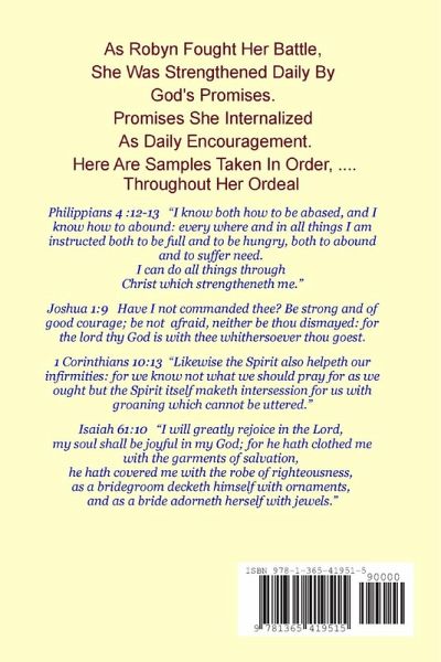 This is a First-Person, Daily Log, of one woman's experience with Cancer and how it strengthened her walk with The Lord. It is nothing if not honest in every regard. It will encourage you, shock you, humble you and lift you up, as you take this marvelous journey with Robyn.