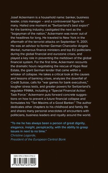 Josef Ackermann is a household name: banker, business leader, crisis manager - and a controversial figure for many. Hailed one moment as "Switzerland's best export" for the banking industry, castigated the next as the "bogeyman of the nation," Ackermann was never out of the headlines for long. He traveled to New York in the aftermath of the terrorist attacks on September 11, 2001. He was an advisor to former German Chancellor Angela Merkel, numerous finance ministers and top EU politicians during the global financial and eurozone crises, and played a key role in preventing the meltdown of the global financial system. For the first time, Ackermann recounts the dramatic hours negotiating the rescue of Hypo Real Estate, the giant German lender that came within a whisker of collapse. He takes a critical look at the causes and lessons of banking crises, analyzes the downfall of Credit Suisse, calls for "war games for bank executives," tougher stress tests, and greater powers for Switzerland's regulator FINMA, including a "Special Financial Action Task Force." Ackermann puts forward concrete suggestions on how to prevent a future financial collapse and formulates his "Ten Maxims of a Good Banker." The author dedicates other chapters to his childhood and family life and shares many personal anecdotes of encounters with politicians, business leaders and royalty around the world."To me he has always been a person of great dignity, elegance, insight, perspicacity, with the ability to grasp issues in next to no time." Christine Lagarde, President of the European Central Bank