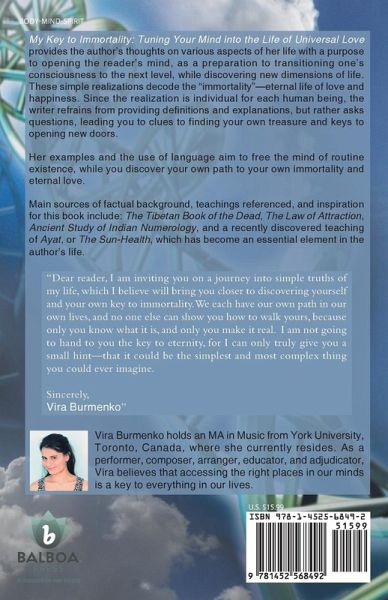 My Key to Immortality: Tuning Your Mind into the Life of Universal Love provides the author's thoughts on various aspects of her life with a purpose to opening the reader's mind, as a preparation to transitioning one's consciousness to the next level, while discovering new dimensions of life. These simple realizations decode the "immortality"-eternal life of love and happiness. Since the realization is individual for each human being, the writer refrains from providing definitions and explanations, but rather asks questions, leading you to clues to finding your own treasure and keys to opening new doors. Her examples and the use of language aim to free the mind of routine existence, while you discover your own path to your own immortality and eternal love. Main sources of factual background, teachings referenced, and inspiration for this book include: The Tibetan Book of the Dead, The Law of Attraction, Ancient Study of Indian Numerology, and a recently discovered teaching of Ayat, or The Sun-Health, which has become an essential element in the author's life. "Dear reader, I am inviting you on a journey into simple truths of my life, which I believe will bring you closer to discovering yourself and your own key to immortality. We each have our own path in our own lives, and no one else can show you how to walk yours, because only you know what it is, and only you make it real. I am not going to hand to you the key to eternity, for I can only truly give you a small hint-that it could be the simplest and most complex thing you could ever imagine. Sincerely, Vira Burmenko"