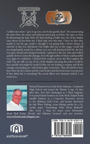 I yelled once more " give it up son, your body guard's dead ",He turned using his same form, the stance and sideways pistol grip as before, the same as when he threatening the lady clerk. He fired sending a bullet into one of the display cases about six feet from me. I fired only once this time, I have no idea why, maybe it was his age, maybe I thought I was giving him a better chance of survival. Is that not ridiculous? One bullet that size at this range, would kill an enraged grisly, much less a skinny, not very well developed kid! He, the kid, was spun around and dropped instantly. I glanced at the two men and walked quickly down to assess the damage. Even though neither of them could possibly ever again be combative, I kicked both weapons across the floor against the wall, I lay my rifle on top of one of the displays knowing the police would be here quickly and might be excited if they saw me holding a weapon and all the carnage surrounding me, with broken glass everywhere. They should have been here when the door alarm and the water heater and electrical noises were present, if they think this is something! The sound effects were dramatic indeed, I can assure you.