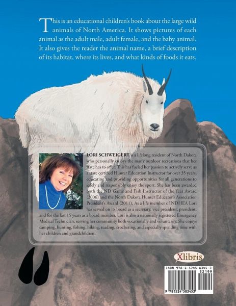 This is an educational children's book about the large wild animals of North America. It shows pictures of each animal as the adult male, adult female, and the baby animal. It also gives the reader the animal name, a brief description of its habitat, where its lives, and what kinds of foods it eats.