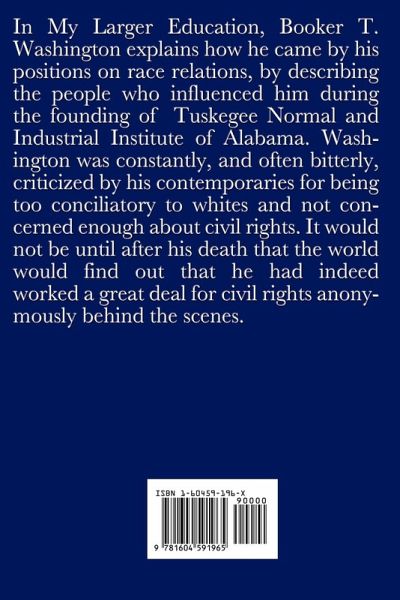 In My Larger Education, Booker T. Washington explains how he came by his positions on race relations, by describing the people who influenced him during the founding of Tuskegee Normal and Industrial Institute of Alabama. Washington was constantly, and often bitterly, criticized by his contemporaries for being too conciliatory to whites and not concerned enough about civil rights. It would not be until after his death that the world would find out that he had indeed worked a great deal for civil rights anonymously behind the scenes.