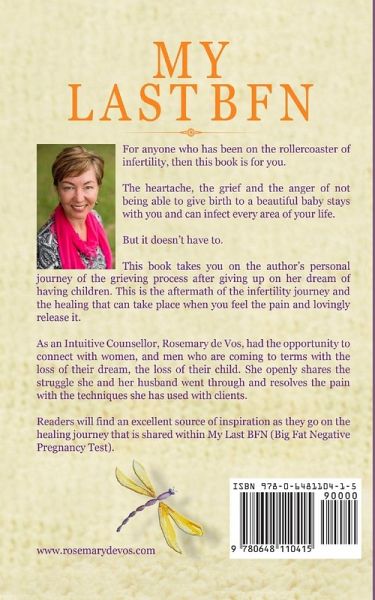 For anyone who has been on the roller coaster of infertility, then this book is for you. The heartache, the grief and the anger of not being able to give birth to a beautiful baby stays with you and can infect every area of your life. But it doesn't have to... My Last BFN takes you on the author's personal journey of the grieving process after giving up on her dream of having children. This is the aftermath of the infertility journey and the healing that can take place when you feel the pain and lovingly release it. As an Intuitive Counsellor and Transformational Coach, Rosemary de Vos, has had the opportunity to connect with women and men who are coming to terms with the loss of their dream, the loss of their child, the loss of having a family. She openly shares the struggle she and her husband went though and resolves the pain with the techniques she uses with clients. Readers will find an excellent source of healing and inspiration as they go on the journey that is shared within My Last BFN (Big Fat Negative Pregnancy Test).