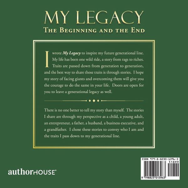 I wrote My Legacy to inspire my future generational line. My life has been one wild ride, a story from rags to riches. Traits are passed down from generation to generation, and the best way to share those traits is through stories. I hope my story of facing giants and overcoming them will give you the courage to do the same in your life. Doors are open for you to leave a generational legacy as well.