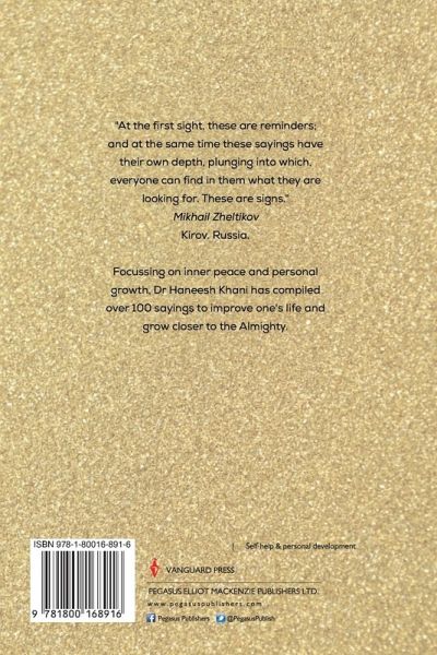 "At the first sight, these are reminders; and at the same time these sayings have their own depth, plunging into which, everyone can find in them what they are looking for. These are signs." Mikhail Zheltikov Kirov. Russia. Focussing on inner peace and personal growth, Dr Haneesh Khani has compiled over 100 sayings to improve one's life and grow closer to the Almighty.