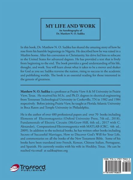 In this book, Dr. Matthew N. O. Sadiku has shared the amazing story of how he rose from his humble beginnings in Nigeria. He described how he was raised in a Muslim home. After his conversion to Christianity, his drive led him to relocate to the United States for advanced degrees. He has provided a text that is lively from beginning to the end. The book provides a good understanding of his life, thought, and work. You will learn about what it takes to be a mover and shaker for God as you see Sadiku traverse the nation, rising to success in the academic and publishing worlds. The book is an essential reading for those interested in the genesis of greatness.