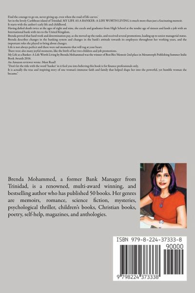 Find the courage to go on, never giving up, even when the road of life curves.' Set in the lovely Caribbean island of Trinidad. MY LIFE AS A BANKER: A LIFE WORTH LIVING is much more than just a fascinating memoir. It starts with the author's early life and childhood. Having defied death twice at the ages of eight and nine, she excels and graduates from High School at the tender age of sixteen and lands a job with an International bank with ties to the United Kingdom. Brenda proved that hard work and determination pay, as she moved up the ranks, and received several promotions, leading up to senior managerial status. Brenda describes changes in the banking system and changes in the bank's attitude towards its employees throughout her working years, and the important roles she played to bring about changes. Life is not always perfect and there were sad moments that will tug at your heart. There were also many joyful moments, like the birth of her two children and job promotions. My Life as a Banker: A Life Worth Living by Brenda Mohammed was the winner of Best Bio/Memoir 2nd place in Metamorph Publishing Summer Indie Book Awards 2016. An Amazon reviewer wrote: Must Read! "Don't let the title with the word 'banker' in it fool you into believing this book is for finance professionals only. It is actually the true and inspiring story of one woman's immense faith and family that helped shape her into the powerful, yet humble woman she became."