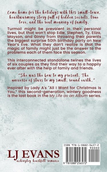 Come home for the holidays with this small-town, heartwarming story full of hidden secrets, true love, and the real meaning of family. Turmoil might be prevalent in their personal lives, but that won't stop Edie, Stephen, Ty, Eliza, Mayson, and Ginny from throwing their parents the biggest surprise 50th birthday party on New Year's Eve. What they don't realize is that the magic of family might just be the answer to the problems each of them face this season. This interconnected standalone twines the lives of six couples as they find their way to a happily ever after with the help of family and friends. "She was the bow to my present. The universe of stars to my small, round earth." Inspired by Lady A's "All I Want for Christmas Is You," this second-generation, wintery goodness is the last book in the My Life as an Album series.