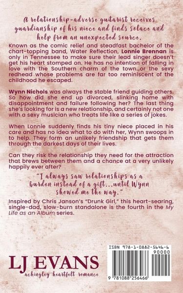 When a relationship-adverse guitarist is handed guardianship of his niece, he finds solace and help from an unexpected source. Known as the comic relief and steadfast bachelor of the chart-topping band, Water Reflection, Lonnie Brennan is only in Tennessee to make sure their lead singer doesn't get his heart stomped on. He has no intention of falling in love with the Southern charm of the town...or the sexy redhead whose problems are far too reminiscent of the childhood he escaped. Wynn Nichols was always the stable friend guiding others. So how did she end up divorced, slinking home with disappointment and failure following her? The last thing she's looking for is a new relationship, and certainly not one with a sexy musician who treats life like a series of jokes. When Lonnie suddenly finds his tiny niece placed in his care and has no idea what to do with her, Wynn swoops in to help. They form an unlikely friendship that gets them through the darkest days of their lives. Can they risk the relationship they need for the attraction that brews between them and a chance at a very unlikely happily ever after? "I always saw relationships as a burden instead of a gift...until Wynn showed me the way." Inspired by Chris Janson's "Drunk Girl," this heart-searing, single-dad, slow-burn standalone is the fourth book in an interconnected, standalone series.