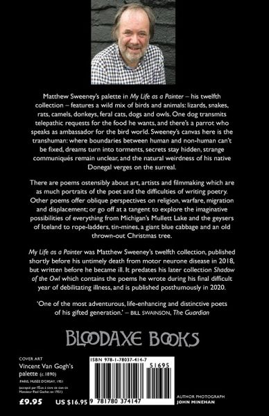 Matthew Sweeney (1952-2018) was born in Lifford, Co. Donegal, Ireland. He moved to London in 1973 and studied at the Polytechnic of North London and the University of Freiburg. After living in Berlin and Timisoara for some years, he returned to Ireland and settled in Cork. He died in August 2018 from motor neurone disease. His poetry collections include: A Dream of Maps (1981), A Round House (1983), The Lame Waltzer (1985) from Allison & Busby / Raven Arts Press; Blue Shoes (1989) and Cacti (1992) from Secker & Warburg; The Bridal Suite (1997), A Smell of Fish (2000), Selected Poems (2002), Sanctuary (2004) and Black Moon (2007) from Jonathan Cape; The Night Post: A Selection (Salt, 2010); Horse Music (2013), Inquisition Lane (2015), My Life as a Painter (2018) and Shadow of the Owl (2020) from Bloodaxe; and King of a Rainy Country (2018) from Arc, a book of prose poems set in Paris, and responding to Baudelaire's Le Spleen de Paris. Black Moon was shortlisted for the T.S. Eliot Prize and for the Irish Times Poetry Now Award. Horse Music won the inaugural Pigott Poetry Prize in association with Listowel Writers' Week, and is a Poetry Book Society Recommendation. Shadow of the Owl is a Poetry Book Society Wild Card Choice for Winter 2020. He also published editions of selected poems in Canada (Picnic on Ice, Vehicule Press, 2002) and two translated by Jan Wagner in Germany, Rosa Milch (Berlin Verlag, 2008) and Hund und Mond (Hanser Berlin, 2017). Jan Wagner's German translation of Shadow of the Owl is forthcoming from Hanser Berlin. He won a Cholmondeley Award in 1987 and an Arts Council Writers' Award in 1999. He also published poetry for children, with collections including The Flying Spring Onion (1992), Fatso in the Red Suit (1995) and Up on the Roof: New and Selected Poems (2001). His novels for children include The Snow Vulture (1992) and Fox (2002). He edited The New Faber Book of Children's Poems (2003) and Walter De la Mare: Poems (2006) for Faber; co-edited Emergency Kit: Poems for Strange Times (Faber, 1996) with Jo Shapcott; and co-wrote Writing Poetry (Teach Yourself series, Hodder, 1997) and the comic novel Death Comes for the Poets (Muswell Press, 2012) with John Hartley Williams.