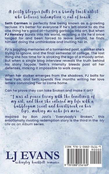 A feisty blogger falls for a grumpy trash artist who believes redemption is out of reach. Seth Carmen is perfectly fine being known as a growling recluse. It's better for everyone if he's left alone to do the one thing he's good at-turning garbage into art. But when PJ Hensley bursts into his world, recalling a life he'd once longed for and been forced to leave behind, he finds himself doing the unthinkable and inviting her in. PJ is juggling memories of a tormented past, a stalker she's trying to ignore, and the final semester of college. The last thing she has time for is stroking the ego of a moody artist. But when a single blog interview reveals the truth behind his stony façade, Seth's intensity bleeds past all her defenses, making it impossible to walk away. When her stalker emerges from the shadows, PJ bolts for New York, and Seth spends five months writing her love letters convincing her to come home. Can he prove they can take broken and make it art? "I was at peace living with the loneliness of my art, and then she entered my life with a bubble gum scent and heartbreak on her lips, making me ache for more." Inspired by Bon Jovi's "Everybody's Broken," this emotionally riveting redemption story is the third in interconnected, standalone series.