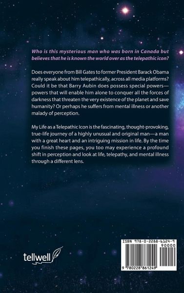 Who is this mysterious man who was born in Canada but believes that he is known the world over as the telepathic icon? Does everyone from Bill Gates to former President Barack Obama really speak about him telepathically, across all media platforms? Could it be that Barry Aubin does possess special powers- powers that will enable him alone to conquer all the forces of darkness that threaten the very existence of the planet and save humanity? Or perhaps he suffers from mental illness or another malady of perception. My Life as a Telepathic Icon is the fascinating, thought-provoking, true-life journey of a highly unusual and original man-a man with a great heart and an intriguing mission in life. By the time you finish these pages, you too may experience a profound shift in perception and look at life, telepathy, and mental illness through a different lens.