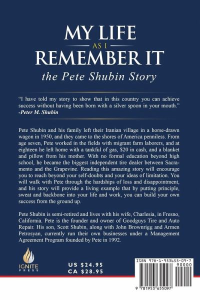 "I have told my story to show that in this country you can achieve success without having been born with a silver spoon in your mouth." -Peter M. Shubin Pete Shubin and his family left their Iranian village in a horse-drawn wagon in 1950, and they came to the shores of America penniless. From age seven, Pete worked in the fields with migrant farm laborers, and at eighteen he left home with a tankful of gas, $20 in cash, and a blanket and pillow from his mother. With no formal education beyond high school, he became the biggest independent tire dealer between Sacramento and the Grapevine. In 1976, Pete took over a nearly bankrupt auto-service store in Madera, and from there he built an organization doing in excess of $30 million per year and providing jobs for 120 employees. Pete will be the first to tell you that he is not as smart as some people might think. He has operated by a few basic principles, such as honesty, sacrifice, accountability, being fair to people, and not living off government subsidies. Reading this amazing story will encourage you to reach beyond your self-doubts and your ideas of limitation. You will walk with Pete through the hardships of loss and disappointment, and his story will provide a living example that by putting principle, sweat and backbone into your life and work, you can build your own success from the ground up.