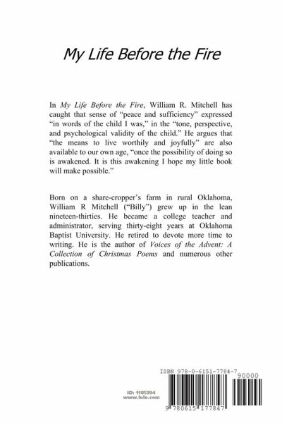 In My Life Before the Fire, William R. Mitchell has caught that sense of "peace and sufficiency" expressed "in words of the child I was," in the "tone, perspective, and psychological validity of the child." He argues that "the means to live worthily and joyfully" are also available to our own age, "once the possibility of doing so is awakened. It is this awakening I hope my little book will make possible."