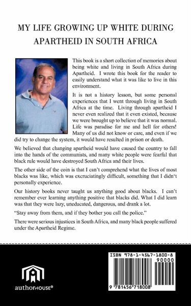 This book is a short collection of memories about being white and living in South Africa during Apartheid. I wrote this book for the reader to easily understand what it was like to live in this environment. It is not a history lesson, but some personal experiences that I went through living in South Africa at the time. Living through apartheid I never even realized that it even existed, because we were brought up to believe that it was normal. Life was paradise for me and hell for others! Many of us did not know or care, and even if we did try to change the system, it would have resulted in prison or death. We believed that changing apartheid would have caused the country to fall into the hands of the communists, and many white people were fearful that black rule would have destroyed South Africa and their lives. The other side of the coin is that I can't comprehend what the lives of most blacks was like, which was excruciatingly difficult, something that I didn't personally experience. Our history books never taught us anything good about blacks. I can't remember ever learning anything positive that blacks did. What I did learn was that they were lazy, uneducated, dangerous, and drank a lot. "Stay away from them, and if they bother you call the police." There were serious injustices in South Africa, and many black people suffered under the Apartheid Regime.