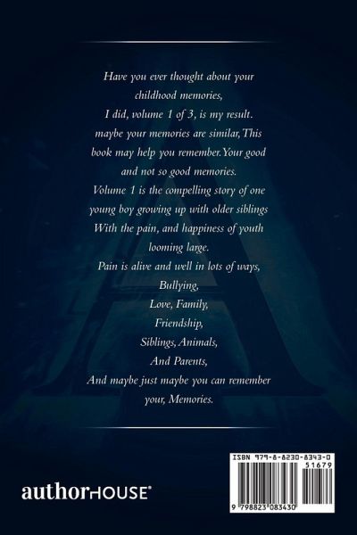 Have you ever thought about your childhood memories, I did, volume 1 of 3, is my result. maybe your memories are similar, This book may help you remember, Your good and not so good memories. Volume 1 is the compelling story of one young boy growing up with older siblings With the pain, and happiness of youth looming large. Pain is alive and well in lots of ways, Bullying, Love, Family, Friendship, Siblings, Animals, And Parents, And maybe just maybe you can remember your, Memories.