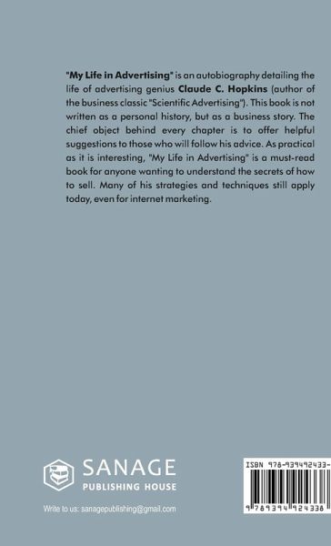 "My Life in Advertising" is an autobiography detailing the life of advertising genius Claude C. Hopkins (author of the business classic "Scientific Advertising"). This book is not written as a personal history, but as a business story. The chief object behind every chapter is to offer helpful suggestions to those who will follow his advice. As practical as it is interesting, "My Life in Advertising" is a must-read book for anyone wanting to understand the secrets of how to sell. Many of his strategies and techniques still apply today, even for internet marketing.
