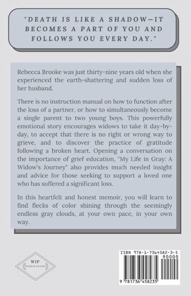 "Death is like a shadow-it becomes a part of you and follows you every day." Rebecca Brooke was just thirty-nine years old when she experienced the earth-shattering and sudden loss of her husband. There is no instruction manual on how to function after the loss of a partner, or how to simultaneously become a single parent to two young boys. This powerfully emotional story encourages widows to take it day-by-day, to accept that there is no right or wrong way to grieve, and to discover the practice of gratitude following a broken heart. Opening a conversation on the importance of grief education, "My Life in Gray: A Widow's Journey" also provides much needed insight and advice for those seeking to support a loved one who has suffered a significant loss. In this heartfelt and honest memoir, you will learn to find flecks of color shining through the gray clouds, at your own pace, in your own way.