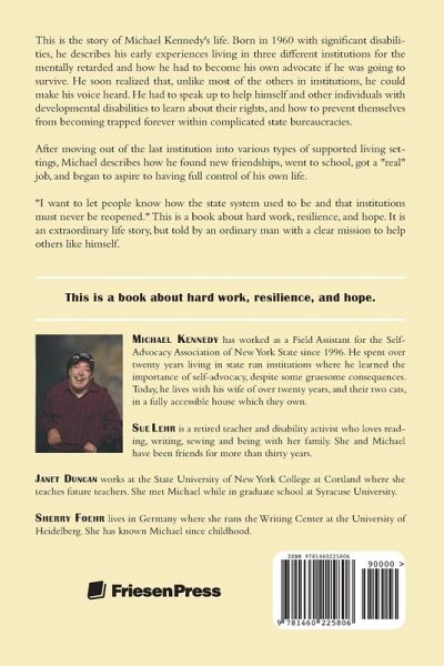 This is the story of Michael Kennedy's life. Born in 1960 with significant disabilities, he describes his early experiences living in three different institutions for the mentally retarded and how he had to become his own advocate if he was going to survive. He soon realized that, unlike most of the others in institutions, he could make his voice heard. He had to speak up to help himself and other individuals with developmental disabilities to learn about their rights, and how to prevent themselves from becoming trapped forever within complicated state bureaucracies. After moving out of the last institution into various types of supported living settings, Michael describes how he found new friendships, went to school, got a "real" job, and began to aspire to having full control of his own life. "I want to let people know how the state system used to be and that institutions must never be reopened." This is a book about hard work, resilience, and hope. It is an extraordinary life story, but told by an ordinary man with a clear mission to help others like himself.