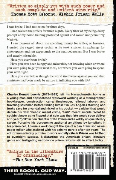 Charles Donald Lowrie (1875-1925) left his Massachusetts home as a young man and hopscotched westward working as a stenographer, construction camp timekeeper, bookkeeper, railroad laborer, and traveling salesman before finding himself in Los Angeles starving and broke save for a vandalized nickel in his pocket - a nickel that would decide his fate: "heads" meant crime, "tails" meant suicide. What he couldn't know as he flipped that coin was that fate would soon deliver a 15-year "jolt" in San Quentin State Prison and a wildly unique literary career. Pursuing his burgeoning authorial ambitions by lamplight in his prison cell, Lowrie's work caught the eye of a San Francisco newspaper editor who assisted with his gaining parole after ten years. The editor immediately put him to work and My Life in Prison was birthed to overnight success, kickstarting the American prison literature genre and instigating nationwide prison reforms still in effect today. ¿¿We Heathens have striven to enhance the text that you're about to experience as much as possible, with the first enhancement being the inclusion of Donald Lowrie's original San Quentin mugshots. We have also corrected myriad spelling and punctuation errors, in addition to updating a few archaic and hyphenated words to reflect their modern usage. Additionally, we have added some 250 footnotes with further corrections and to supplement the text with context, clarification, and commentary as needed. We've also added section breaks in some of the chapters to help with Lowrie's sometimes jarring tendency to switch topics without warning. We were also able to locate several photos of San Quentin approximate to the period of Lowrie's incarceration, circa 1890s-1910s, which we have included where appropriate. And, in addition to Lowrie's mugshots, we were able to locate nearly two dozen more mugshots of inmates who populate this story, which we have placed where they seem most appropriate within the text.