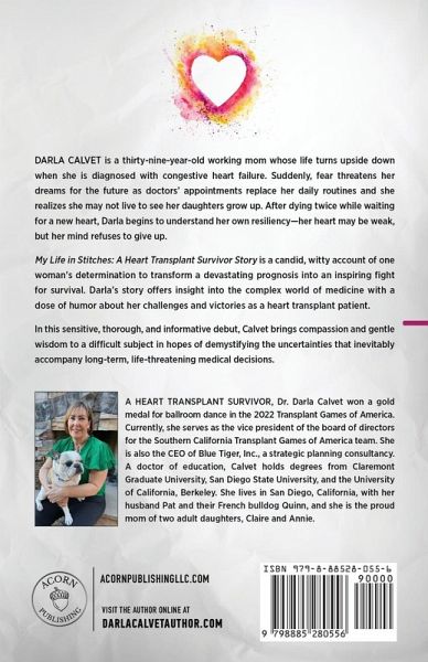 Darla Calvet is a thirty-nine-year-old working mom whose life turns upside down when she is diagnosed with congestive heart failure. Suddenly, fear threatens her dreams for the future as doctors' appointments replace her daily routines and she realizes she may not live to see her daughters grow up. After dying twice while waiting for a new heart, Darla begins to understand her own resiliency-her heart may be weak, but her mind refuses to give up. My Life in Stitches: A Heart Transplant Survivor Story is a candid, witty account of one woman's determination to transform a devastating prognosis into an inspiring fight for survival. Darla's story offers insight into the complex world of medicine with a dose of humor about her challenges and victories as a heart transplant patient. In this sensitive, thorough, and informative debut, Calvet brings compassion and gentle wisdom to a difficult subject in hopes of demystifying the uncertainties that inevitably accompany long-term, life-threatening medical decisions.
