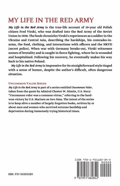 My Life in the Red Army is the true-life account of 19-year old Polish citizen Fred Virski, who was drafted into the Red Army of the Soviet Union in 1938. The book chronicles Virski's experiences as a soldier in the Ukraine and Central Asia, describing the hardships, his comrades-in-arms, the food, clothing, and interactions with officers and the NKVD (secret police). When war with Germany breaks-out, Virski witnesses scenes of brutality and is caught in fierce fighting, where he is wounded and hospitalized. Following his recovery, he eventually makes his way back to his native Poland. My Life in the Red Army is impressive for its straightforward style tinged with a sense of humor, despite the author's difficult, often dangerous situation.
