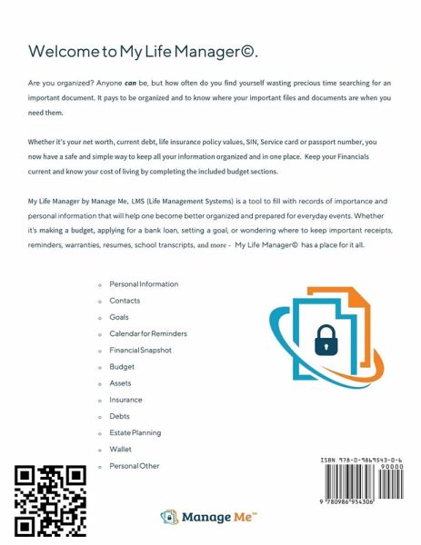 Discover the ultimate life manager and record all of your personal information in one simple book! Designed as a practical workbook to record your essential information, personal details, financial records and beyond, My Life Manager© aims to provide people with an easy place to keep track of important documents, set valuable life goals for yourself, and never lose important information again. With an easy-to-use layout and ample space for recording your reminders and warranties, resumes, legal agreements, assets and net worth, contacts, and more, this handy log book ensures that you'll never …mehr