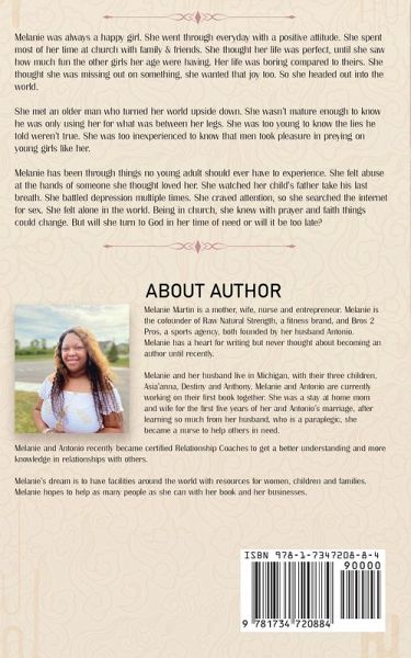 Melanie was always a happy girl who faced each day with a positive attitude. She spent most of her time at church with family & friends. She thought her life was perfect until she saw how much fun the other girls her age were having. Her life was boring compared to theirs. She thought she was missing out on something, and she wanted to experience joy too. So she headed out into the world and met an older man who turned her world upside down. She wasn't mature enough to know that he was only using her for what was between her legs and that men like him took pleasure in preying on young girls like her. Melanie has been through things no young adult should ever have to experience. She experienced abusive relationships, watched her child's father take his last breath, and has suffered depression multiple times. She felt alone and craved attention, so she searched the internet for sex. Being in church, she knew with prayer and faith; things could change. But will she turn to God in her time of need, or will it be too late?
