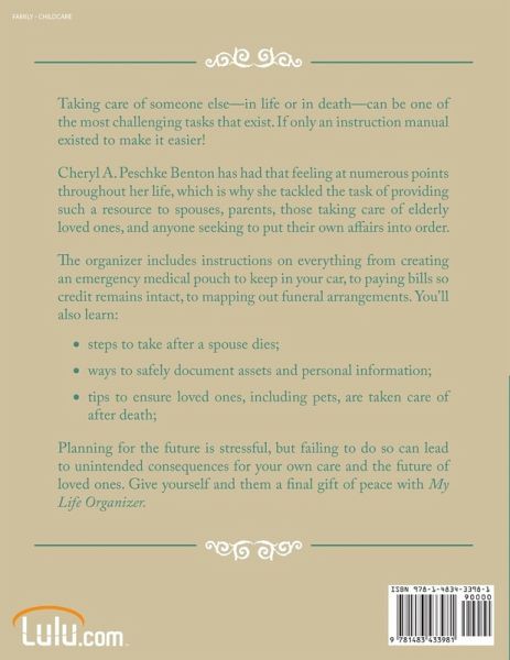 Taking care of someone else-in life or in death-can be one of the most challenging tasks that exist. If only an instruction manual existed to make it easier! Cheryl A. Peschke Benton has had that feeling at numerous points throughout her life, which is why she tackled the task of providing such a resource to spouses, parents, those taking care of elderly loved ones, and anyone seeking to put their own affairs into order. The organizer includes instructions on everything from creating an emergency medical pouch to keep in your car, to paying bills so credit remains intact, to mapping out funeral arrangements. You'll also learn: steps to take after a spouse dies; ways to safely document assets and personal information; tips to ensure loved ones, including pets, are taken care of after death; Planning for the future is stressful, but failing to do so can lead to unintended consequences for your own care and the future of loved ones. Give yourself and them a final gift of peace with My Life Organizer.