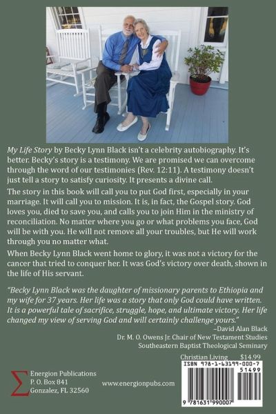 My Life Story by Becky Lynn Black isn't a celebrity autobiography. It's better. Becky's story is a testimony. We are promised we can overcome through the word of our testimonies (Rev. 12:11). A testimony doesn't just tell a story to satisfy curiosity. It presents a divine call. The story in this book will call you to put God first, especially in your marriage. It will call you to mission. It is, in fact, the Gospel story. God loves you, died to save you, and calls you to join Him in the ministry of reconciliation. No matter where you go or what problems you face, God will be with you. He will not remove all your troubles, but He will work through you no matter what. When Becky Lynn Black went home to glory, it was not a victory for the cancer that tried to conquer her. It was God's victory over death, shown in the life of His servant. "Becky Lynn Black was the daughter of missionary parents to Ethiopia and my wife for 37 years. Her life was a story that only God could have written. It is a powerful tale of sacrifice, struggle, hope, and ultimate victory. Her life changed my view of serving God and will certainly challenge yours." -David Alan Black, Dr. M. O. Owens Jr. Chair of New Testament Studies, Southeastern Baptist Theological Seminary