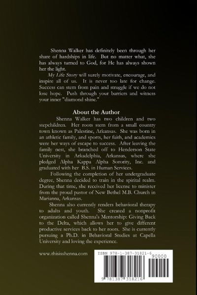 Shenna Walker is an author of My Life Story and I AM Me. She is the daughter of Pam and Michael. She is also the proud mother to Jada and Jadon. Shenna has just released her 2nd Album titled Black Love and continues to thrive through her creativity of music and books.