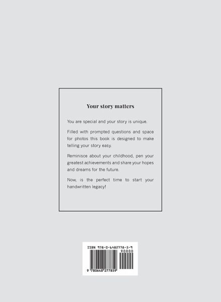 This beautiful hardcover journal is filled with prompted questions to make telling your story easy. It covers everything from your favorite things to your goals for the future. There are ample pages for photos and reminiscing on all the wonderful moments from your past. This is your handwritten legacy to the next generation. Your story matters!