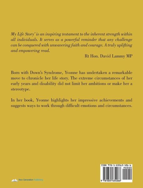 My Life Story' is an inspiring testament to the inherent strength within all individuals. It serves as a powerful reminder that any challenge can be conquered with unwavering faith and courage. A truly uplifting and empowering read. Rt Hon. David Lammy MP Born with Down's Syndrome, Yvonne has undertaken a remarkable move to chronicle her life story. The extreme circumstances of her early years and disability did not limit her ambitions or make her a stereotype. In her book, Yvonne highlights her impressive achievements and suggests ways to work through difficult emotions and circumstances.