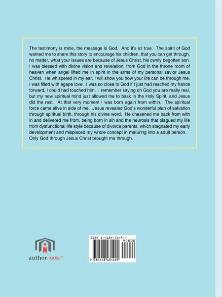 The testimony is mine, the message is God. And it's all true. The spirit of God wanted me to share this story to encourage his children, that you can get through, no matter, what your issue are because of Jesus Christ, his ownly begotten son. I was bless with divine vision and and revalation, from God in the throne room of heaven when angle lifted me in spirit in the arms of my personal savior Jesus Christ. He whisper in my ear, I will show you how your life can be through me. I was filled with agape love. I was so close to God if I just had reach my hands forward, I could had touch him. I remember saying oh God you are really real, but my new spiritual mind just allowed me to bask in the Holy Spirit, and Jesus did the rest. At that very moment I was born again from within. The spiritual force came alive in side of me. Jesus reveal God's wonderful plan of salvation through spiritual birth, through his divine word he chasen me back from with in and deliver me from, being born in sin and the nerosis that plague my life from dysfunctional life style because of divorce parents, which staggered my early development and misplaced my whole concept in maturing into adult person. Only God through Jesus Christ brought me through.
