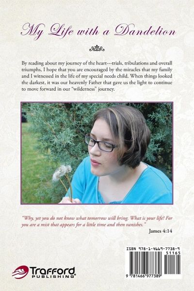 By reading about my journey of the heart-trails, tribulations, and overall triumphs-I hope that you are encouraged by the miracles that my family and I witnessed in the life of my special-needs child. When things looked the darkest, it was our heavenly Father that gave us the light to continue to move forward in our "wilderness journey." While most of these pages have come directly from the pages of my personal journal, I have chosen to omit the names of some people and places to protect the innocent and guilty alike. I've also chosen to refer to my daughter in this story by her nickname, LuLu, as that is what she likes to be called. I will honestly admit to you that this book has brought healing to me, although it was difficult and very painful for me to relive some of the events of the past. My hope for you, dear reader, is that you will acquire a better understanding of just how precious life truly is and that no life should be considered less valuable than another. My husband and I have had the privilege of living in the house that belonged to his grandmother. We've been able to raise our three children in the same house that holds so many childhood memories for him. It's located in Millbrook, Alabama-north of the state's capital, Montgomery. Living in this city has given us the warm feeling of family and a sense of comfort with its Southern charm and friendly faces. With our corner lot, our azalea filled yard, and our house full of memories, I sat down to record every step of my journey with our little "dandelion." "Why, yet you do not know what tomorrow will bring. What is your life? For you are a mist that appears for a little time and then vanishes" (James 4:14).