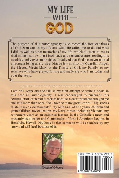 The purpose of this autobiography is to record the frequent times of God Moments In my life and what He called me to do and what I did, as well as other memories of my life, which all seem to me as God moments, now that I look back and remember after reading this autobiography over many times, I realized that God has never missed a moment being at my side. Maybe it was also my Guardian Angel, the Blessed Virgin Mary, or the Trinity of God, my Family, or my relatives who have prayed for me and made me who I am today and over the years. I am 85+ years old and this is my first attempt to write a book, in this case an autobiography. I was encouraged to endeavor this accumulation of personal stories because a dear friend encouraged me and said more than once "You have so many great stories." My stories relate to my "God moments", my wife Luci of 66+ years, children and grandchildren, my education, my Navy career, including Viet Nam, my retirement years as an ordained Deacon in the Catholic church and presently as a leader and Commander of Post 1 American Legion, in Honolulu, Hawaii. My hope is that someone will be touched by my story and will heal because of it.
