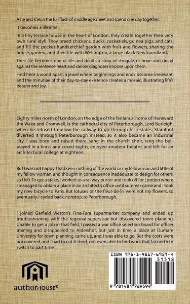 A he and she, in the full flush of middle age, meet and spend one day together. It becomes a lifetime. In a tiny terrace house in the heart of London, they create together their very own rural idyll. They breed chickens, ducks, cockatiels, guinea pigs, and cats, and fill the pocket-handkerchief garden with fruit and flowers, sharing the house, garden, and their life with Wellington, a large black Newfoundland. Their life becomes one of life and death, a story of struggle, of hope and dread against the sentence heart and cancer diagnoses impose upon them. Find here a world apart, a jewel where beginnings and ends become irrelevant, and the minutiae of their day-to-day existence creates a mosaic, illustrating life's beauty and joy.