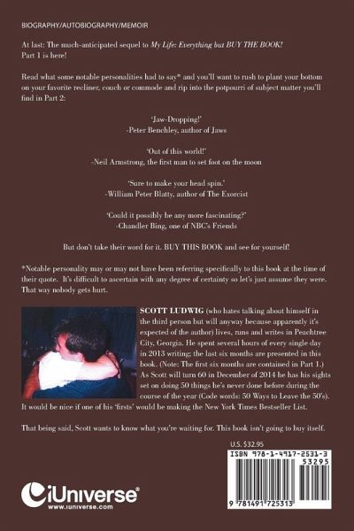 At last: The much-anticipated sequel to My Life: Everything but BUY THE BOOK! Part 1 is here! Read what some notable personalities had to say* and you'll want to rush to plant your bottom on your favorite recliner, couch or commode and rip into the potpourri of subject matter you'll find in Part 2: 'Jaw-Dropping!' -Peter Benchley, author of Jaws 'Out of this world!' -Neil Armstrong, the first man to set foot on the moon 'Sure to make your head spin.' -William Peter Blatty, author of The Exorcist 'Could it possibly be any more fascinating?' -Chandler Bing, one of NBC's Friends But don't take their word for it. BUY THIS BOOK and see for yourself! *Notable personalities may or may not have been referring specifically to this book at the time of their quote. It's difficult to ascertain with any degree of certainty so let's just assume they were. That way nobody gets hurt.