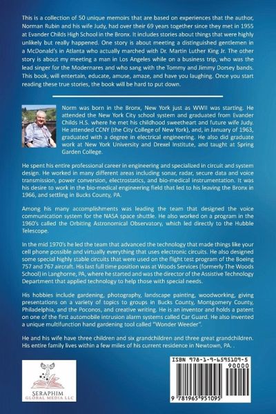 This is a collection of 50 unique memoirs that are based on experiences that the author, Norman Rubin and his wife Judy, had over their 69 years together since they met in 1955 at Evander Childs High School in the Bronx. It includes stories about things that were highly unlikely but really happened. One story is about meeting a distinguished gentlemen in a McDonald's in Atlanta who actually marched with Dr. Martin Luther King Jr. The other story is about my meeting a man in Los Angeles while on a business trip, who was the lead singer for the Modernares and who sang with the Tommy and Jimmy Dorsey bands. This book, will entertain, educate, amuse, amaze, and have you laughing. Once you start reading these true stories, the book will be hard to put down.