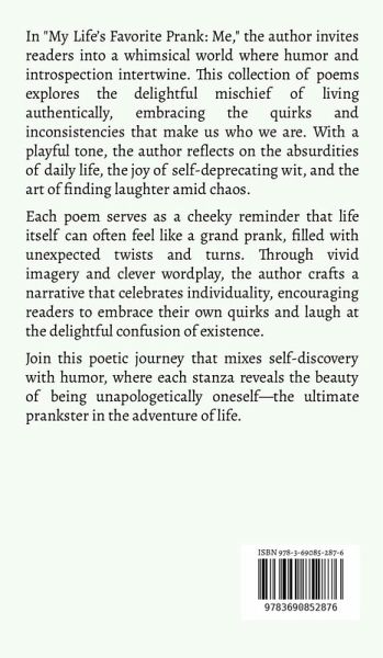 In "My Life's Favorite Prank: Me," the author invites readers into a whimsical world where humor and introspection intertwine. This collection of poems explores the delightful mischief of living authentically, embracing the quirks and inconsistencies that make us who we are. With a playful tone, the author reflects on the absurdities of daily life, the joy of self-deprecating wit, and the art of finding laughter amid chaos. Each poem serves as a cheeky reminder that life itself can often feel like a grand prank, filled with unexpected twists and turns. Through vivid imagery and clever wordplay, the author crafts a narrative that celebrates individuality, encouraging readers to embrace their own quirks and laugh at the delightful confusion of existence. Join this poetic journey that mixes self-discovery with humor, where each stanza reveals the beauty of being unapologetically oneself-the ultimate prankster in the adventure of life.