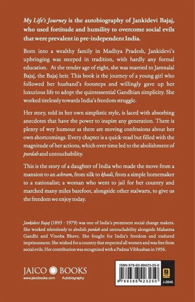 Foreword by RAHUL BAJAJ AN AUTOBIOGRAPHY My Life's Journey is the autobiography of Jankidevi Bajaj, who used fortitude and humility to overcome social evils that were prevalent in pre-independent India. Born into a wealthy family in Madhya Pradesh, Jankidevi's upbringing was steeped in tradition, with hardly any formal education. At the tender age of eight, she was married to Jamnalal Bajaj, the Bajaj heir. This book is the journey of a young girl who followed her husband's footsteps and willingly gave up her luxurious life to adopt the quintessential Gandhian simplicity. She worked tirelessly towards India's freedom struggle. Her story, told in her own simplistic style, is laced with absorbing anecdotes that have the power to inspire any generation. There is plenty of wry humour as there are moving confessions about her own shortcomings. Every chapter is a quick-read but filled with the magnitude of her actions, which over time led to the abolishment of purdah and untouchability. This is the story of a daughter of India who made the move from a mansion to an ashram, from silk to khadi, from a simple homemaker to a nationalist; a woman who went to jail for her country and marched many miles barefoot, alongside other stalwarts, to give us the freedom we enjoy today. Jankidevi Bajaj (1893 - 1979) was one of India's prominent social change makers. She worked relentlessly to abolish purdah and untouchability alongside Mahatma Gandhi and Vinoba Bhave. She fought for India's freedom and endured imprisonment. She wished for a country that respected all women and was free from social evils. Her contribution was recognized with a Padma Vibhushan in 1956.