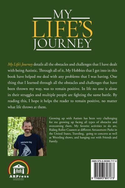 My Life's Journey details all the obstacles and challenges that I have dealt with being Autistic. Through all of it, My Hobbies that I get into in this book have helped me deal with any problems that I was having. One thing that I Iearned through all the obstacles and challenges that have been thrown my way, was to remain positive. In life no one is alone in their struggles and multiple people are fighting the same battle. By reading this, I hope it helps the reader to remain positive, no matter what life throws at them.